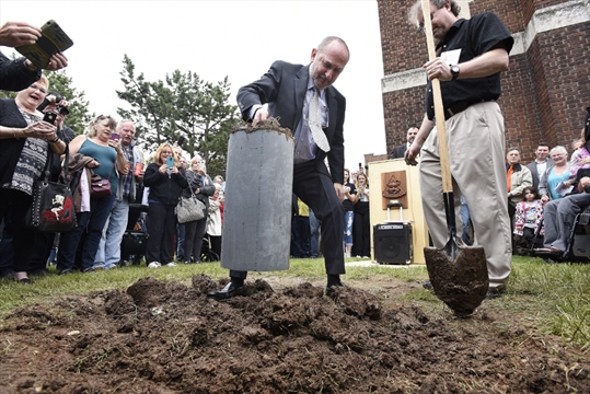 (Joe Nadel retrieves the capsule that he and Bob O’Hoski put into the ground 50 years ago. Picture taken by John Rennison, Hamilton Spectator)